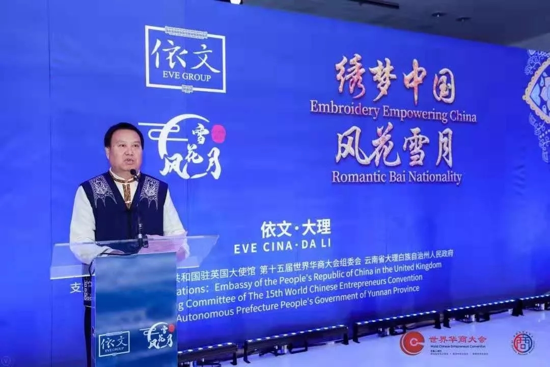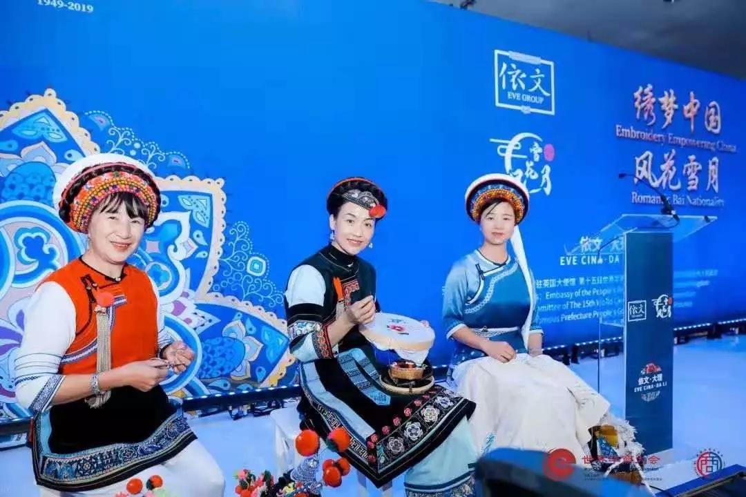 他說道:近看鮮花撲鼻,清風(fēng)拂面;遠(yuǎn)眺山間白雪,月光如鏡,這是云南大理的風(fēng)花雪月,也是大理白族手工藝人繡進(jìn)夢里的日子。在云南省大理白族自治州政府的努力和北京依文集團(tuán)的大力支持下,在年輕一代繡娘們的不懈努力下,白族服飾記憶、民族文化復(fù)興和振興民族產(chǎn)業(yè)的愿望越來越強(qiáng)烈,帶著這樣的使命與責(zé)任,這次我們推薦了6位白族繡娘走到距中國9000多公里之外的英國,再由這里走向世界到更大的舞臺(tái),這是中國少數(shù)民族文化傳承與發(fā)展的夢想。