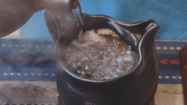 烤茶要煮,這能夠把更多的內(nèi)含物質(zhì)釋放出來,茶湯滋味更豐富。煮出來的茶湯,口感更加軟滑,味道也會更加甘甜。特別是云南炭火煮茶提倡的小火慢慢熬煮,這和燉湯有同理之處。高溫慢火,加上烤后茶葉自有的溫度,更能使茶葉的香氣迸發(fā)出來,與水恰到好處相融,便有觸及味覺的口感。