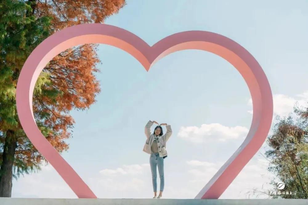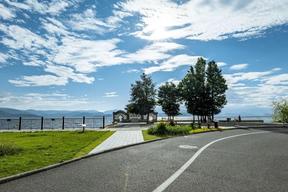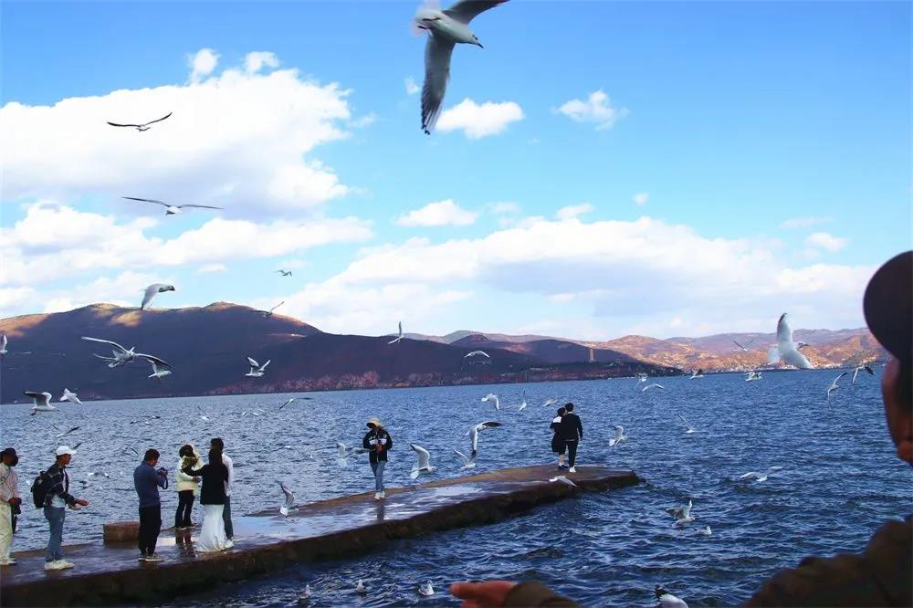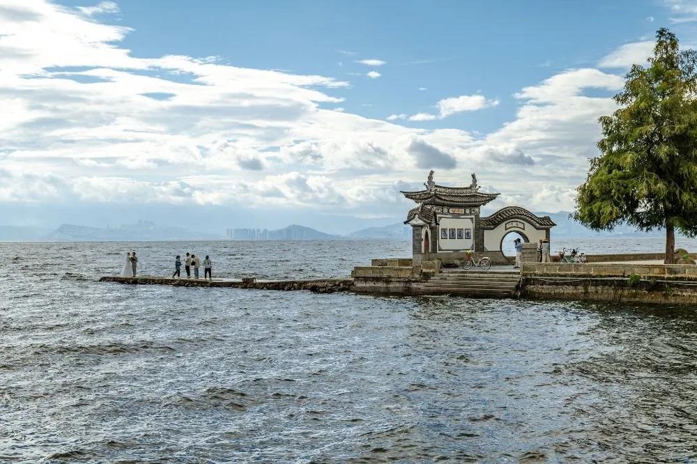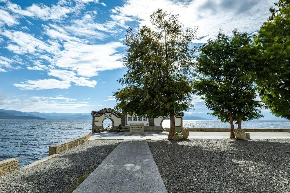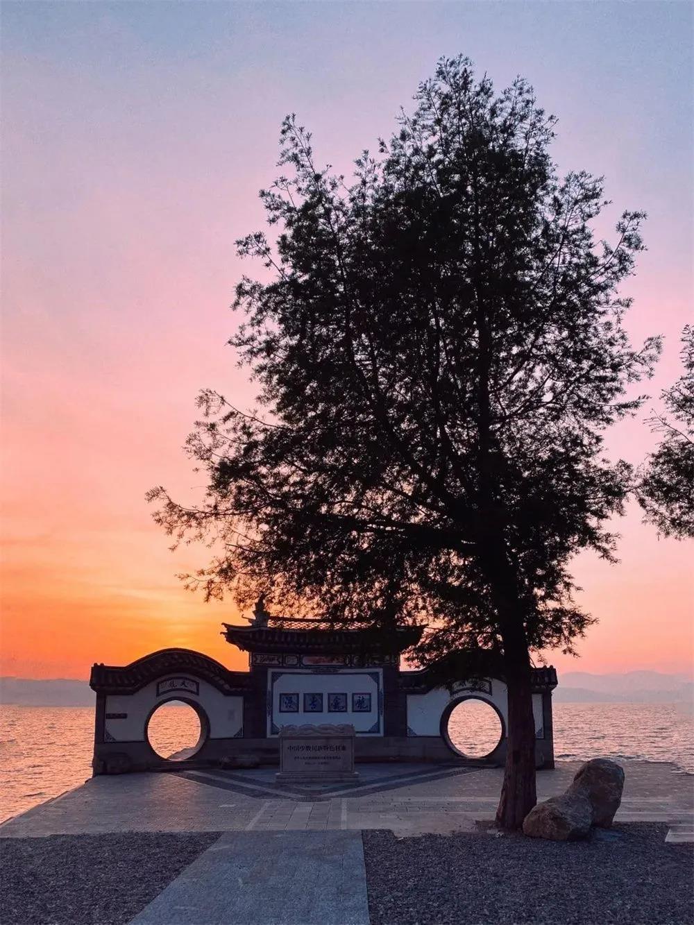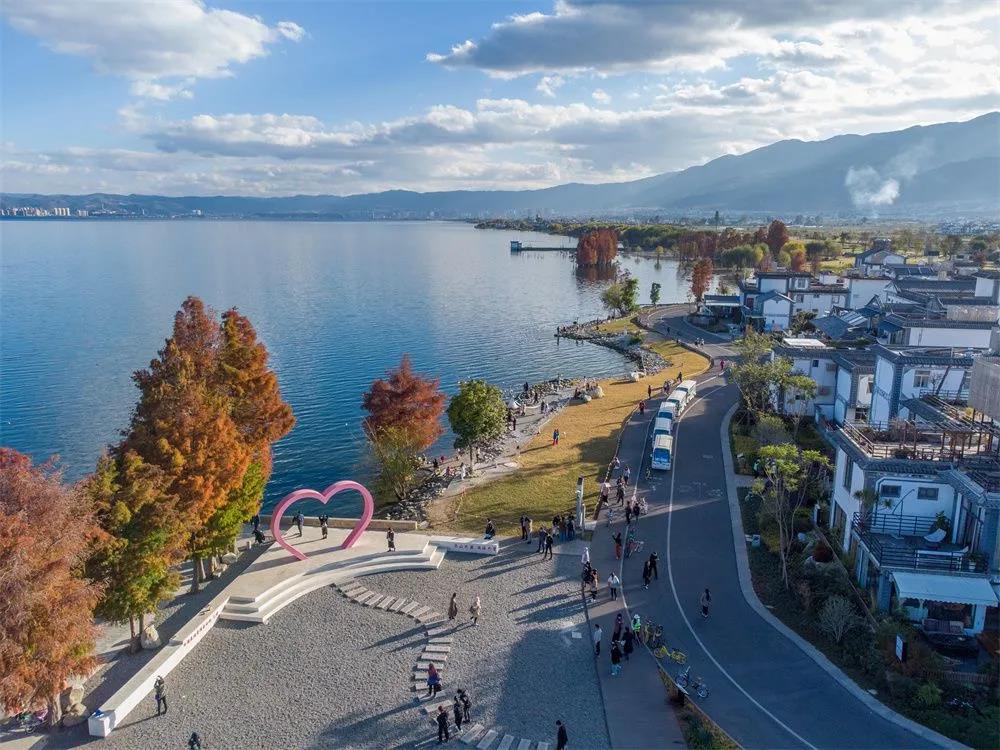 看北側(cè)洱海邊上嬌艷似火的紅杉