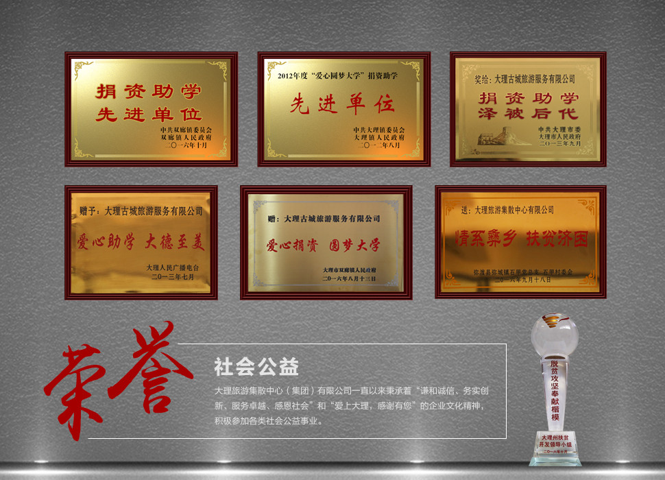 大理旅游集散中心(集團)有限公司一直以來秉承著“謙和誠信、務(wù)實創(chuàng)新、服務(wù)卓越、感恩社會”和“愛上大理,感謝有您”的企業(yè)文化精神,積極參加各類社會公益事業(yè)。