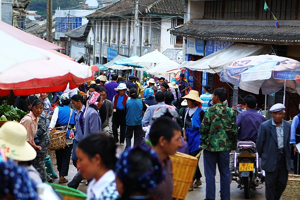而在離雙廊十多公里外的挖色,這里的集市更加熱鬧非凡。挖色的街天為公歷5日、10日,即隔5日一個街天,這一日,挖色鎮(zhèn)外其他鄉(xiāng)鎮(zhèn)的居民也會紛紛奔向挖色的集鎮(zhèn),如織的人流穿梭在形形色色的地攤商店里,或購買菜蔬食品,或購買衣物鞋襪,又或者在小吃攤前吃一碗酸辣爽口的涼米線……集市是大理人生活的一個略影,外鄉(xiāng)人到大理最不可錯過。