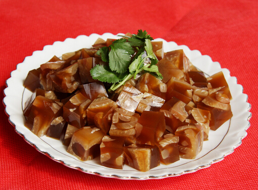 大理地區(qū)喜食凍魚凍肉,凍皮就是把豬蹄和豬皮燉爛,與湯汁一起盛入碗中隔夜放涼,變成像果凍一樣的一道涼菜,口感爽滑,營養(yǎng)豐富。