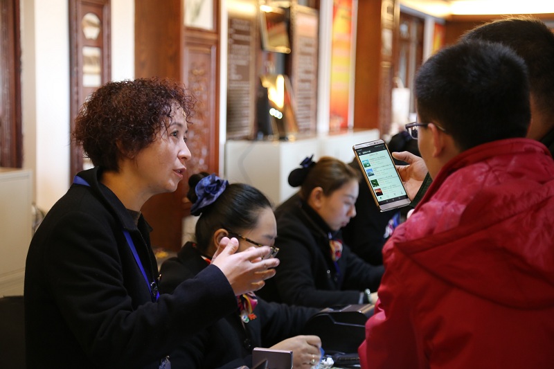 (安全質(zhì)檢部經(jīng)理廖小英在耐心地向游客介紹公司的旅游產(chǎn)品)