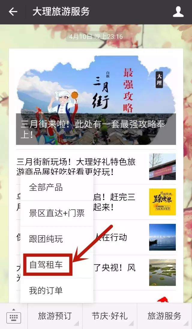 Step1:搜索關(guān)注微信公眾號“大理旅游服務(wù)”,點(diǎn)擊菜單進(jìn)入“自駕租車”;