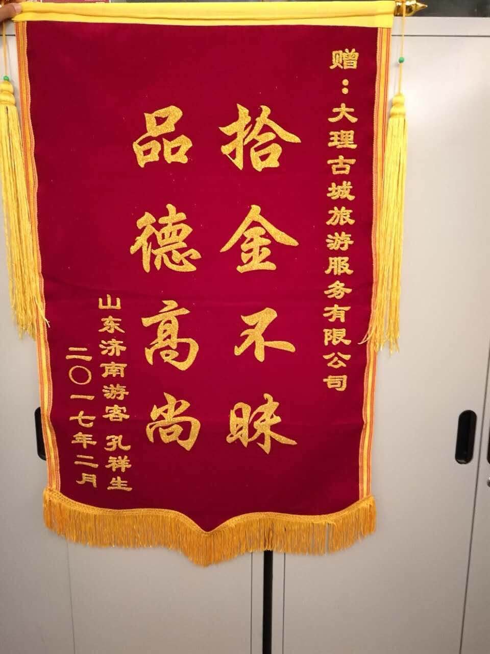 2017年1月25日,大理古城旅游服務有限公司運營部駕駛員鄭麗才在其駕駛的108號車輛上撿到手機一部,他第一時間將手機上交至部門負責人,經多方查找,確認失主后,部門負責人與團隊導游取得聯(lián)系,最終將手機歸還給了失主。事后,失主對鄭麗財同志拾金不昧的行為大加贊賞,并于2017年2月17日向我公司寄來感謝信一封及“拾金不昧、品德高尚”錦旗一面作為感謝。