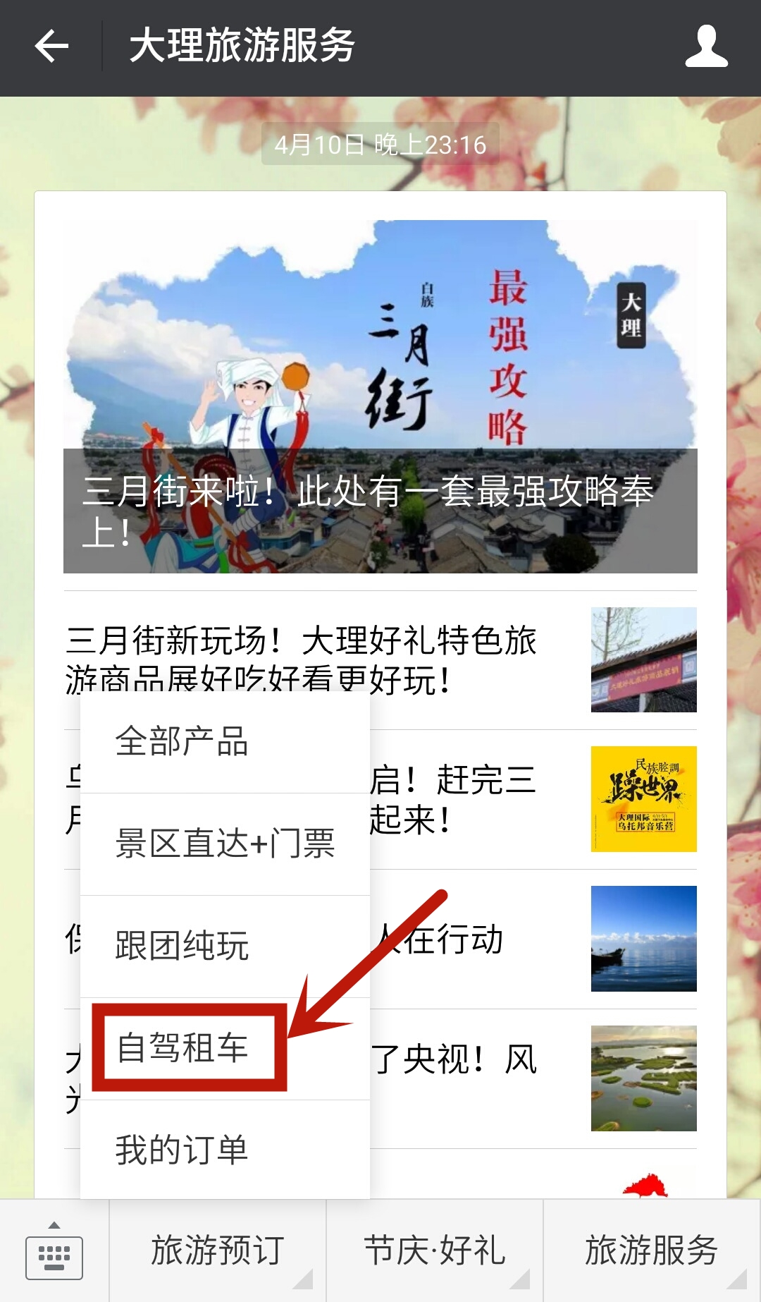 Step1:搜索關(guān)注微信公眾號(hào)“大理旅游服務(wù)”,點(diǎn)擊菜單進(jìn)入“自駕租車”;