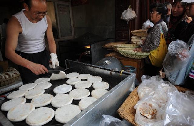 喜洲粑粑最大的特點就是外酥里嫩,有明顯的酥層,這歸功于發(fā)面的過程。小麥粉加適量上堿,揉透,多次在面團(tuán)中搓揉進(jìn)豬油進(jìn)行分層,這就叫油酥面,破酥還有一個比較形象的叫法“重(chong)油”,大理喜洲破酥粑粑就是用這樣的重油面團(tuán)進(jìn)行“烤制”的。