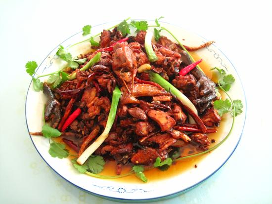 永平黃燜雞,是當(dāng)?shù)氐囊坏捞厣穗龋彩钱?dāng)?shù)乩习傩照写腿说募央取?ldquo;黃燜雞”的制作方法簡(jiǎn)單,但是要把它做好,就不太容易了。黃燜雞采用當(dāng)?shù)貎?yōu)質(zhì)土仔雞,宰殺好洗凈,剁成2厘米大小的方塊;然后將干辣椒去把、除籽,切成長(zhǎng)節(jié)。注入鍋內(nèi)的香油量要適中,將油燒熱,把花椒、姜、干辣椒放入鍋中炸成黑色,投入仔雞塊,加入適量的醬油、蔥、蒜等,翻炒幾下,蓋上鍋蓋,然后等待雞肉水分干而發(fā)黃,再翻炒兩次即可裝入盤(pán)中食用。要說(shuō)選料、配料,大家都能做到,為什么唯獨(dú)永平黃燜雞最具特色呢?這關(guān)鍵在于火候的控制,炒燜雞塊一定要掌握火候,只有用旺盛的火炒燜出來(lái)的才不會(huì)失去真味。