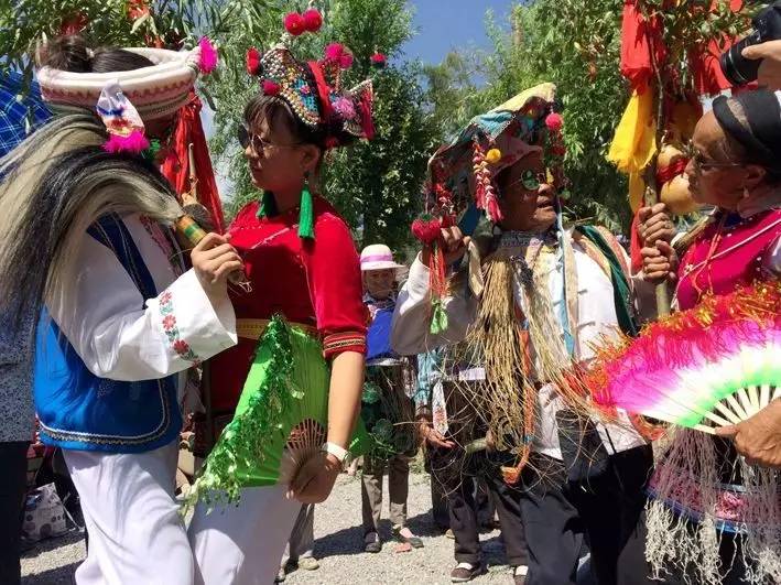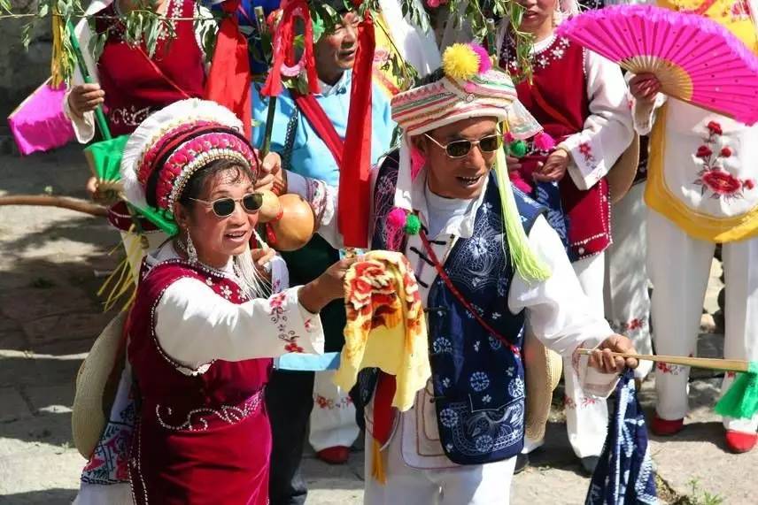 樹枝上掛著紅綢系著的葫蘆,據(jù)說葫蘆象征母腹,紅綢象征陰血。他們口唱的調(diào)子稱“活恩枯”直譯為“花柳曲”,一唱一和,類擬相聲的逗和哏,皆以男女艷情和生育為內(nèi)容,幽默風(fēng)趣。其后的歌舞隊列,唱的也都是充滿艷情的調(diào)子,跳的是霸王鞭和八角鼓舞,舞姿多有男女背靠背、心合心、腳勾腳等形式,無拘無束地表達(dá)著熾熱的情感。