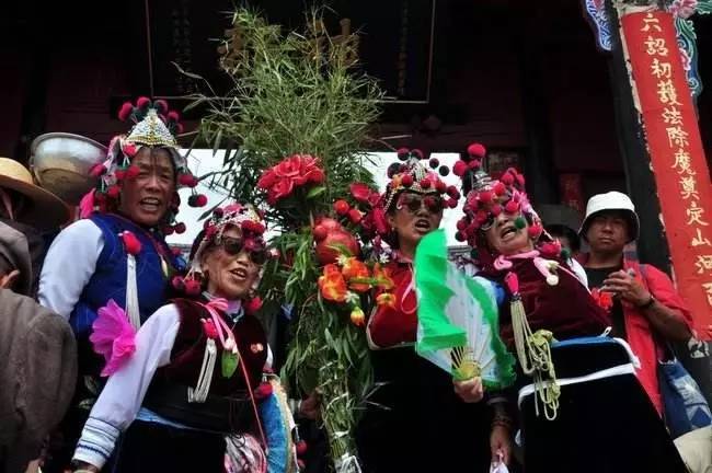 “繞三靈”活動的特點(diǎn),除了向本主神靈祈求風(fēng)調(diào)雨順的內(nèi)容之外,主要在于其歌舞活動所表現(xiàn)的男女情愛無所顧忌,放達(dá)不拘。每個歌舞隊列領(lǐng)頭者均為男女巫二人,他們以一手共執(zhí)一株齊人高的樹枝,另一手分別揮舞牦牛尾和花手巾,邊舞邊唱,引領(lǐng)著隊伍緩緩前行。