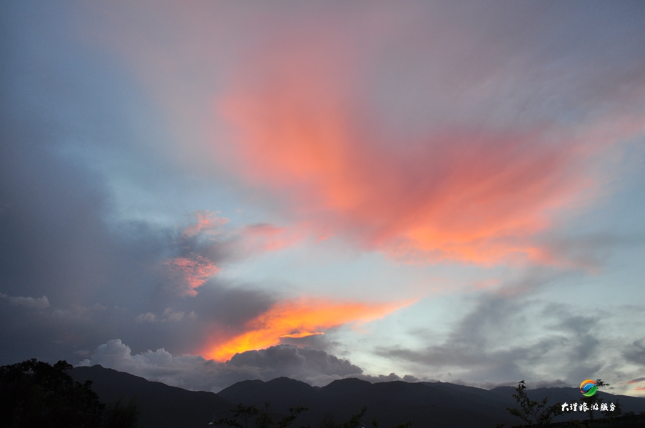 “夕陽無限好,只是近黃昏”,太陽悄悄的藏到了蒼山后面。云彩雖能遮住它偉岸的身軀,卻遮不住它那耀眼奪目的光芒。于是云就變成了這個(gè)樣子。