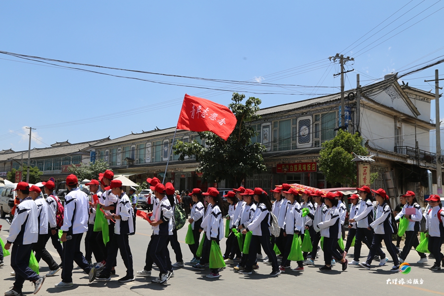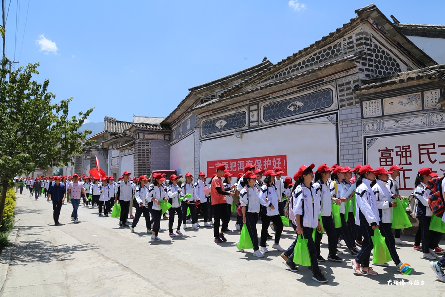 500多位青少年頭戴志愿者紅色標志帽,沿著喜洲古鎮(zhèn)、城北村、龍湖到海舌公園進行垃圾清理以及保護洱海“七大行動”的宣傳資料發(fā)放。驕陽烈日,汗水濕透了每一個志愿者的衣衫。徒步十多公里的路程,志愿者們熱情高漲,在洱海保護治理中爭做“洱海先鋒”,不覺得苦不覺得累。