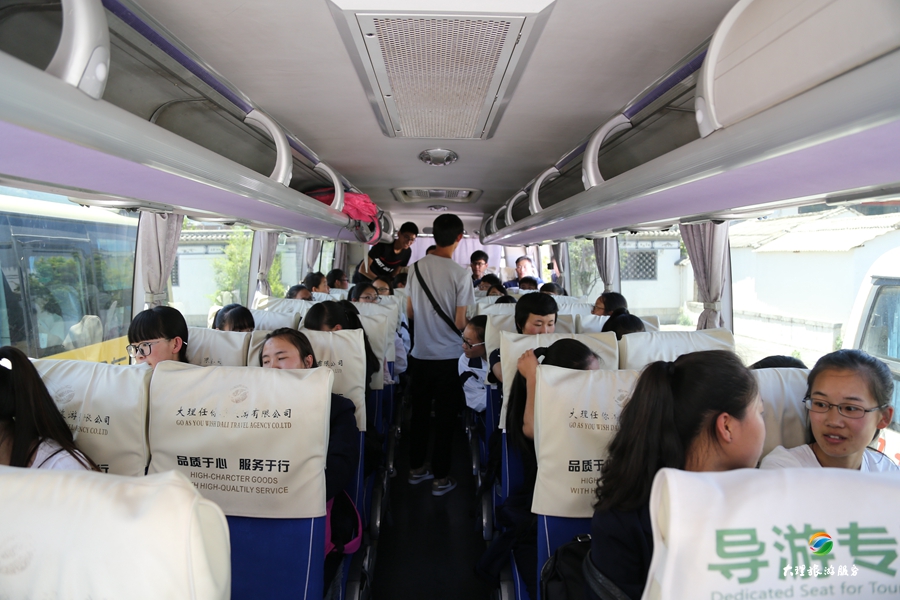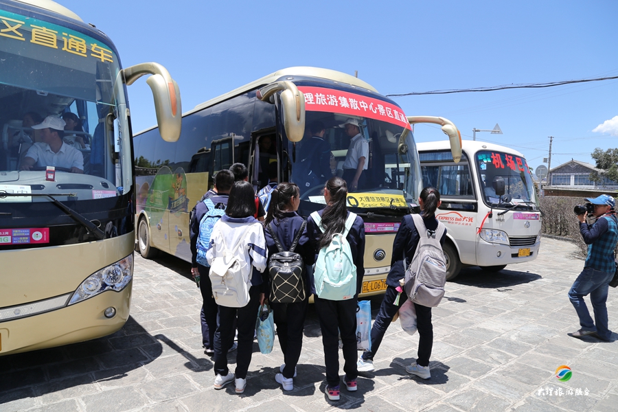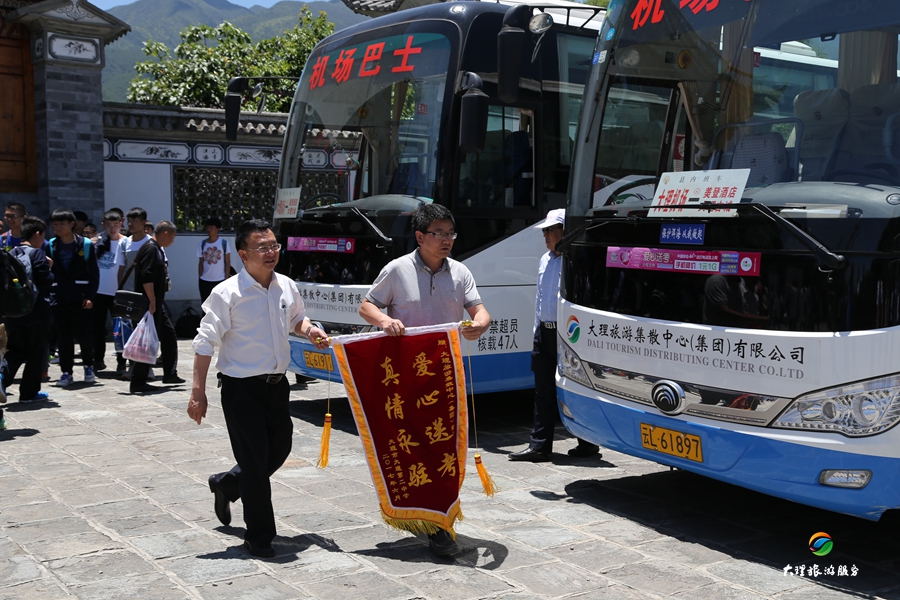 原來,這180名學(xué)生都是高三學(xué)生,是準(zhǔn)備到古城考點參加被稱為“人生轉(zhuǎn)折點”的高考。下午一點十分,大理旅游集散中心(集團)有限公司旗下的大理任你游旅游服務(wù)有限公司的五輛景區(qū)直通車貼著“愛心送考”的標(biāo)識井然有序的來到大理二中門口。因為大理二中距離考點30公里左右,所以他們要把考生送到考點附近的酒店。