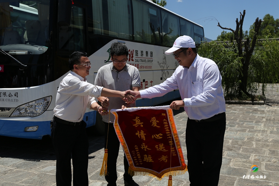 大理二中位于喜洲鎮(zhèn),離大理古城高考考點有30公里左右的距離,考生到考點很不方便。從校長那里了解到,以前參加高考的考生都要自己坐車到古城考試,很是不方便,自從有了“愛心送考”以后,讓考生不再擔(dān)心,安心備考。下午一點半,校長把“愛心送考 真情永駐”的錦旗珍重的交給大理旅游集散中心(集團)有限公司旗下的大理任你游旅游服務(wù)有限公司副總經(jīng)理楊恒東。