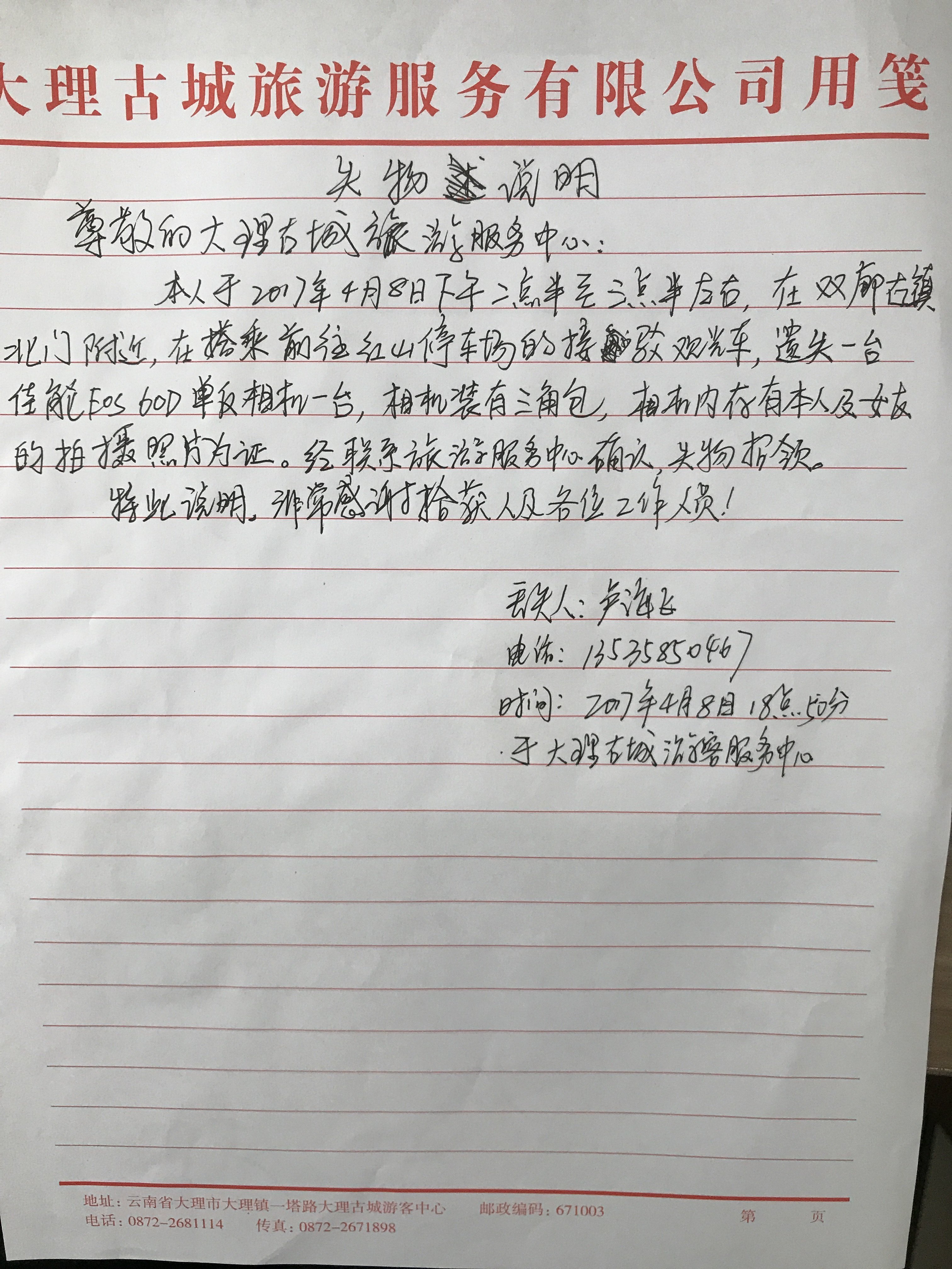 2017年4月8日,公司工作人員趙慶和楊慧在雙廊北口游覽觀光車乘車點撿到一部單反相機,及時交給雙廊分公司負責(zé)人。失主在返回大理古城后,發(fā)現(xiàn)相機遺失,向我公司直通車乘務(wù)員尋求幫助。乘務(wù)組長何云敏詳細地了解了失主的行程,與相關(guān)服務(wù)點聯(lián)系落實后,將相機從雙廊帶回大理古城游客中心,在與失主當(dāng)面確認相機的品牌、顏色、外觀無誤后,將相機歸還給失主。失主對我公司的工作人員拾金不昧的精神、優(yōu)質(zhì)的服務(wù)大加贊賞。