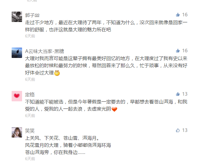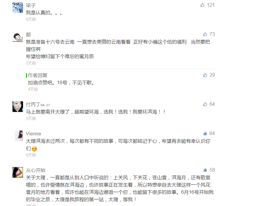 “大理旅游服務(wù)”平臺為了讓更多關(guān)注我們的游客體驗到大理景區(qū)直通車的服務(wù),特意在6月10日這天發(fā)布了一個“6月18日,免費環(huán)洱海”的活動?;顒拥姆绞绞窃谠u論區(qū)留言點贊,前三十名留言的小伙伴將獲得免費體驗的名額。文章剛推送,留言區(qū)就被刷爆了。