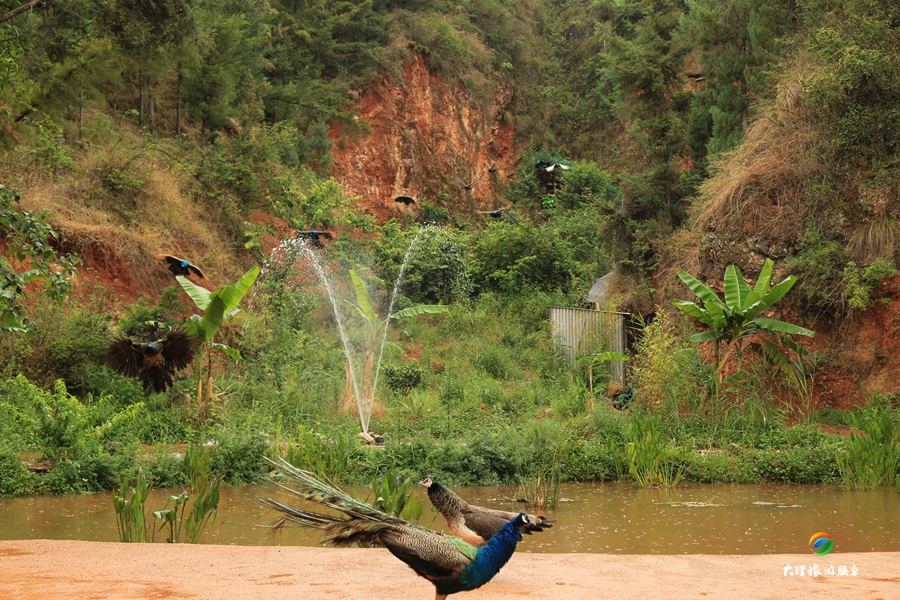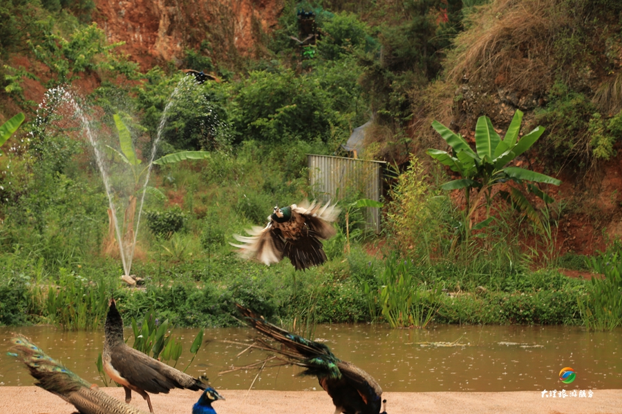 打跳結(jié)束后,大家圍在一起觀看了孔雀放飛表演。隨著音樂聲響起,由東南處的洞穴陸續(xù)飛到露天舞臺,或積極覓食、或閑逛游走、或藏于樹椏、或艷麗開屏、或高傲不理,獨有特色。