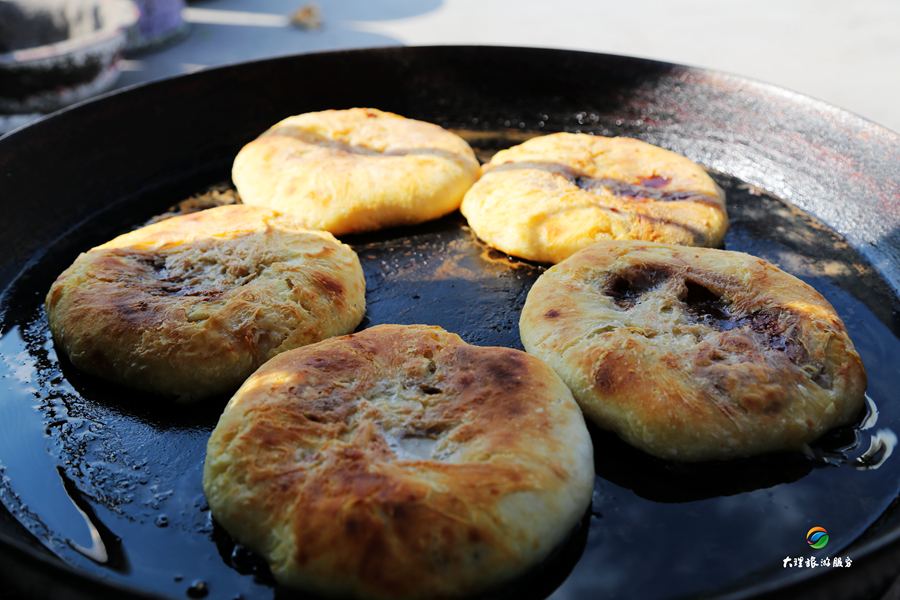 到達喜洲古鎮(zhèn)的時候趕上了飯點,才剛跨進四方街,喜洲粑粑的香味撲鼻而來。都說這喜洲粑粑是不能打包的,要吃現(xiàn)做的,好不容易來到喜洲,這粑粑還得使勁往嘴里塞,這不,都快搶起來了,“老板,來一個!”“好哩!”“老板,再來一個”“好哩!”“老板,再來一個”“好哩!”“阿鵬,還要嗎?”“夠了,吃飽了!”三個喜洲粑粑的午飯,吃得一臉幸福,這時再配上個喜洲老冰棒,心里別提多美了。