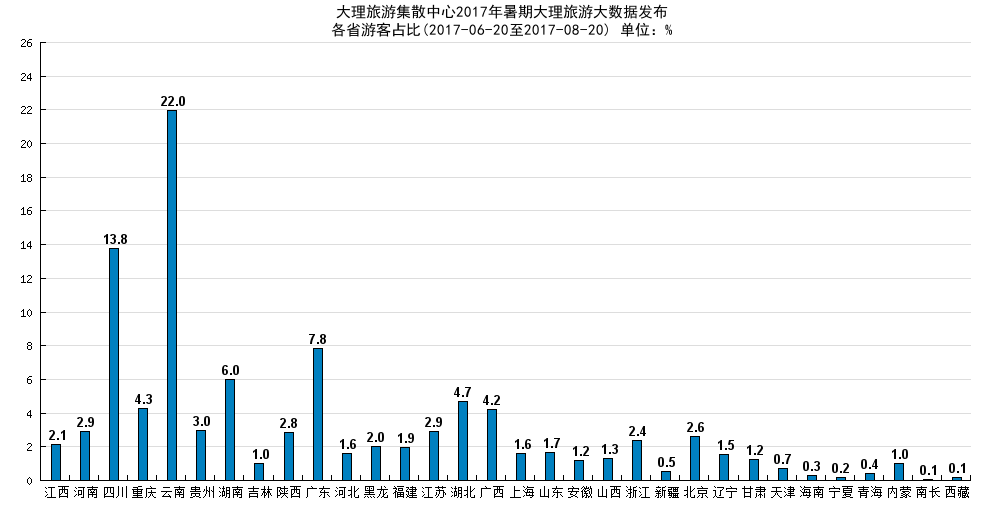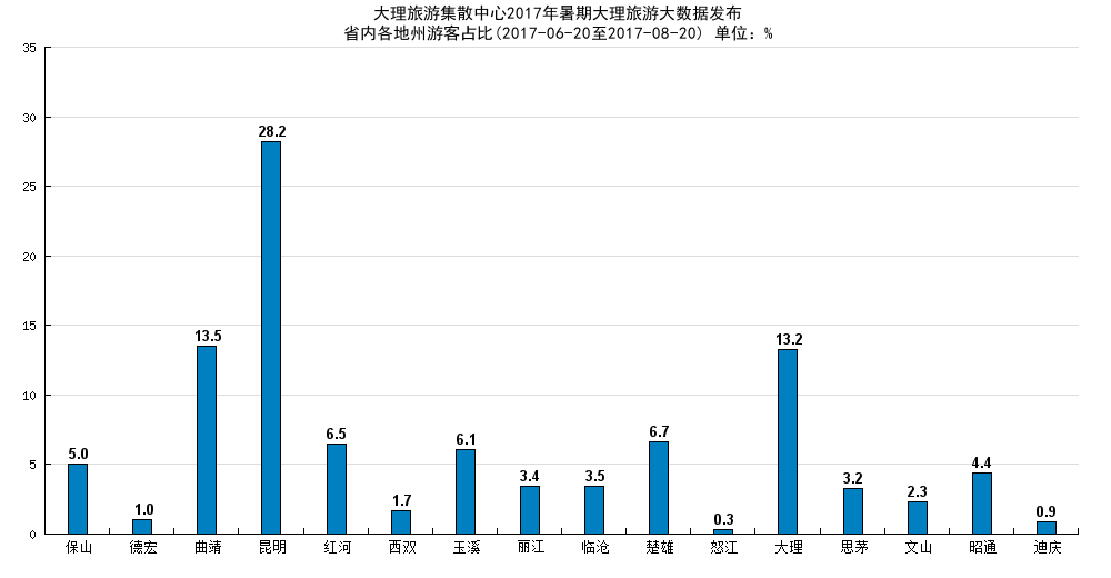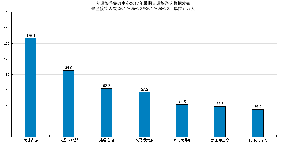 從 2017-06-20 至 2017-08-20,大理機場吞吐量為29.7307萬人,其中進港15.0459萬人、出港14.6848萬人,大理市景區(qū)共接待游客 450.87萬 人次,最受歡迎的景區(qū)為:大理古城已接待:126.45萬 人次;天龍八部影視城已接待:85.04萬 人次;感通索道已接待:62.22萬 人次;洗馬潭大索道已接待:57.52萬 人次;洱海大游船已接待:41.46萬 人次;崇圣寺三塔已接待:38.54萬 人次;南詔風情島已接待:34.97萬 人次 。