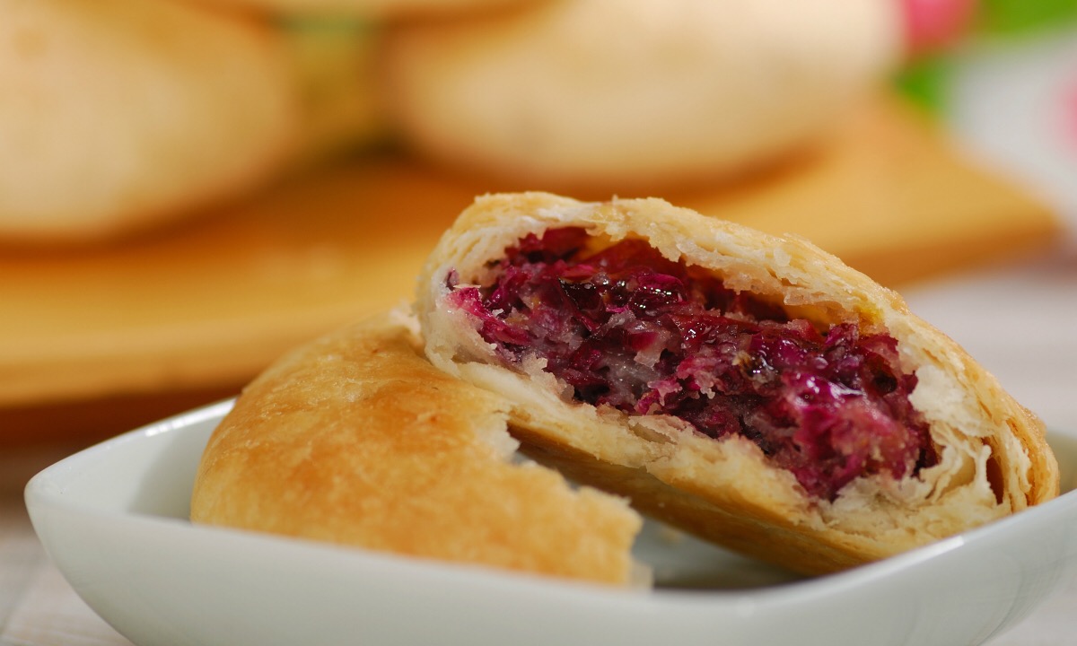 第四步是成餅。第一層是皮,第二層是酥心,第三層是餡料,手法參照包湯圓,包成球狀之后壓成餅狀即可;