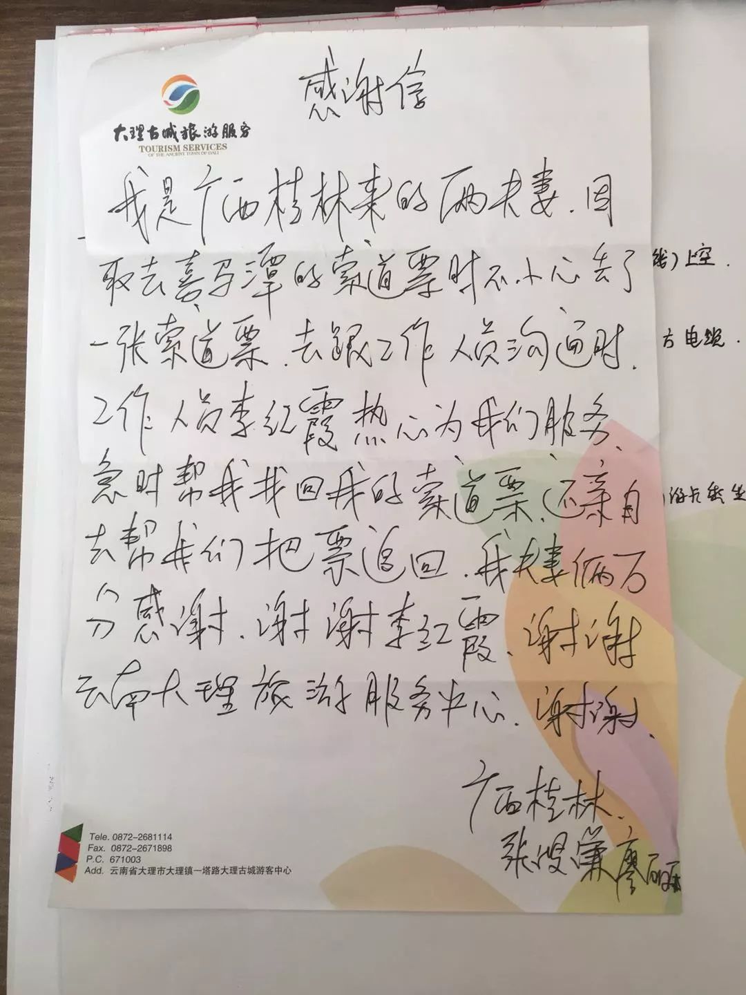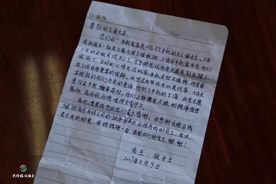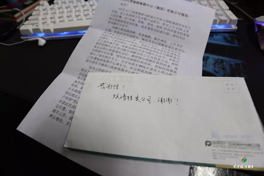 信中說到,10月15日中午11點左右,大理任你游旅行社有限公司機場巴士乘務(wù)員沈璐像往常一樣,在車上給游客介紹大理的風土人情。大巴車行駛到觀音塘左右,沈璐突然接到一個電話,聽對方的語氣似乎很著急,原來是之前在市區(qū)下車的一位游客,因為有事趕著去怒江,在乘坐機場巴士的時候,把錢包放遺落在了座位上,在超市購物的時候才知道錢包丟失了,錢包里有重要的信息和所有的證件,現(xiàn)在很著急!