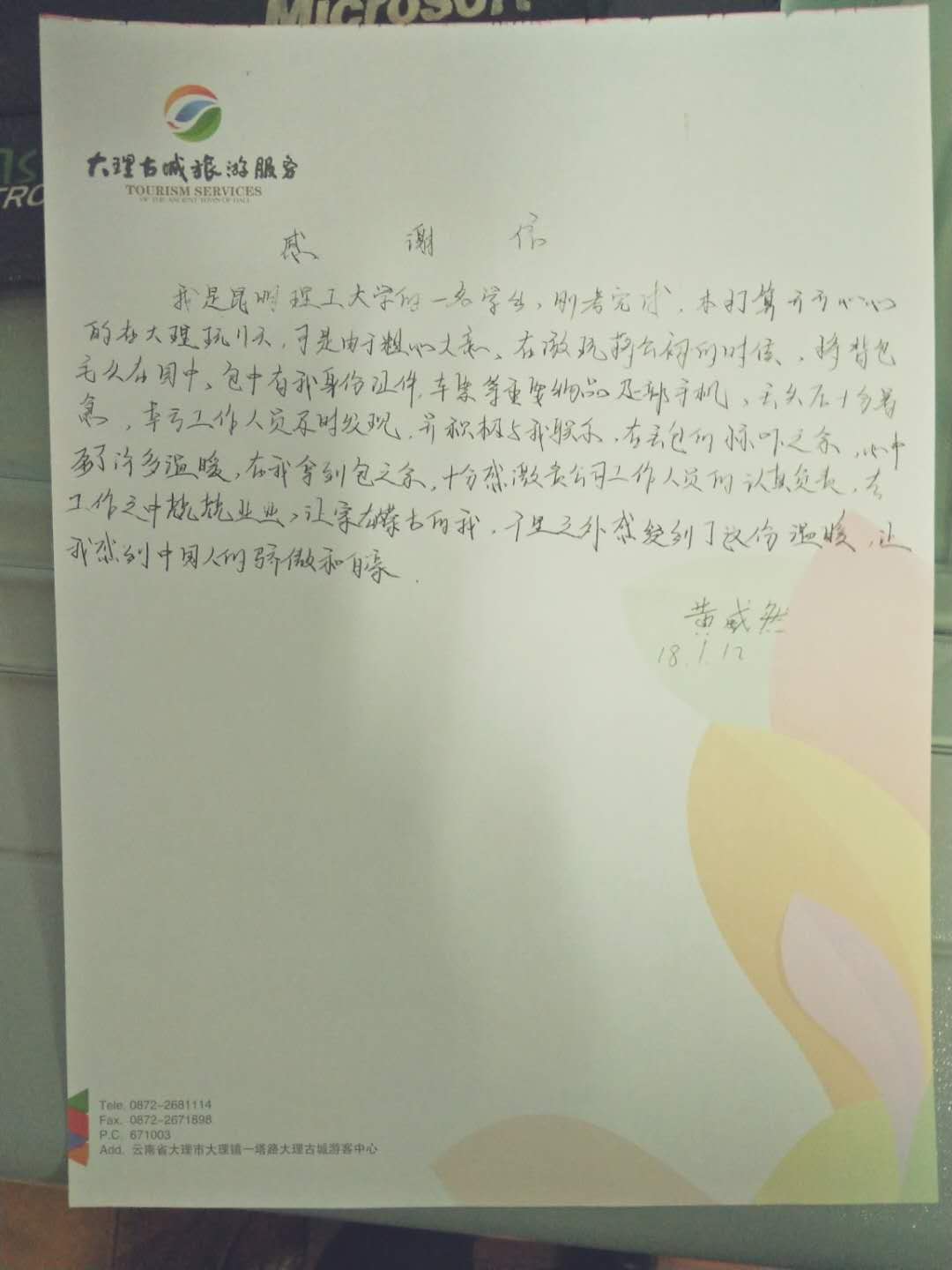 蔣公祠工作人員發(fā)現(xiàn)了客人丟失的包后,及時(shí)與失主取得聯(lián)系。包包失而復(fù)得,這名內(nèi)蒙游客留下了一封感謝信。