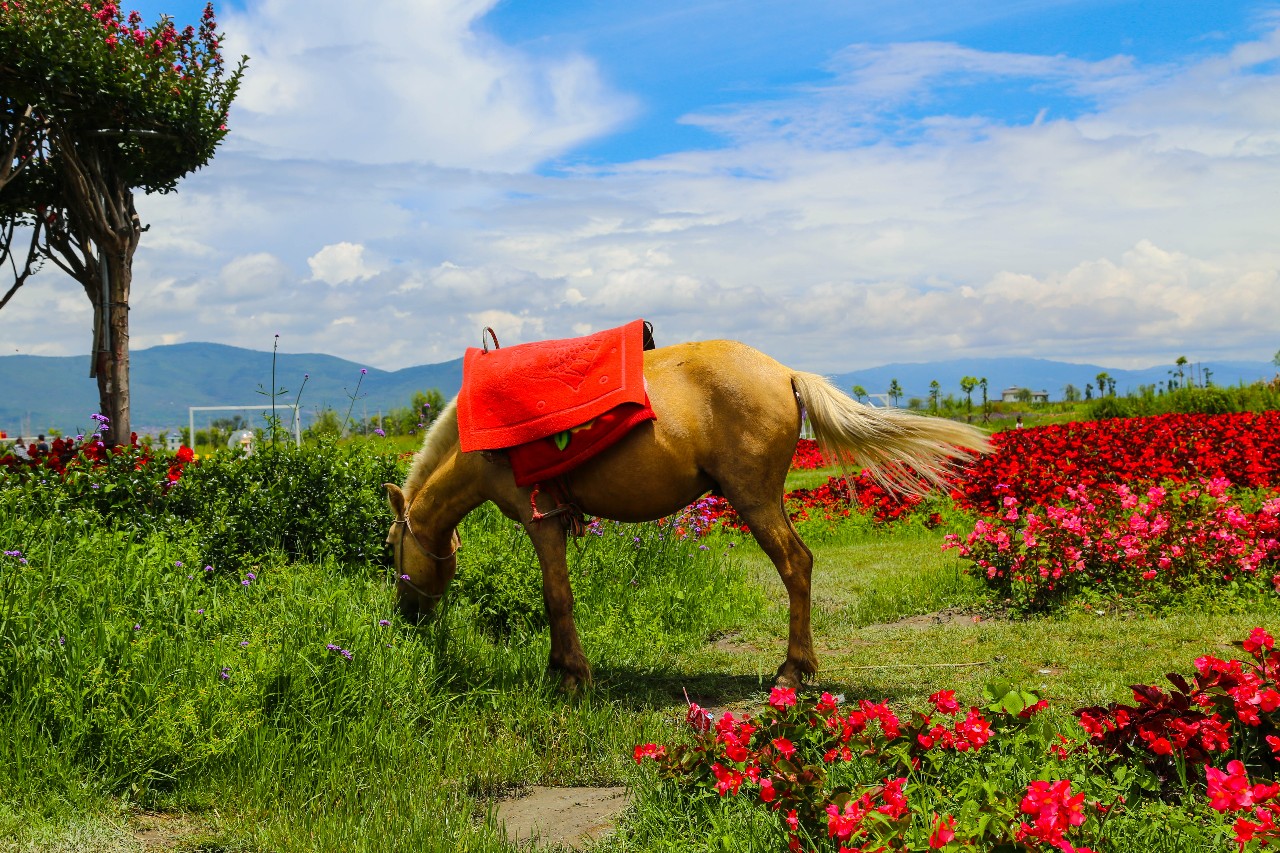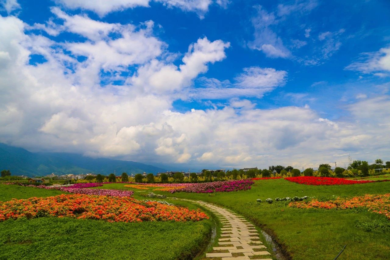 蒼山腳下,最迷人的風(fēng)光就是田野和花海。抬頭看,是連綿的蒼山,玉帶云纏繞山間;近處是連片的花海,色彩斑斕,格外浪漫。
