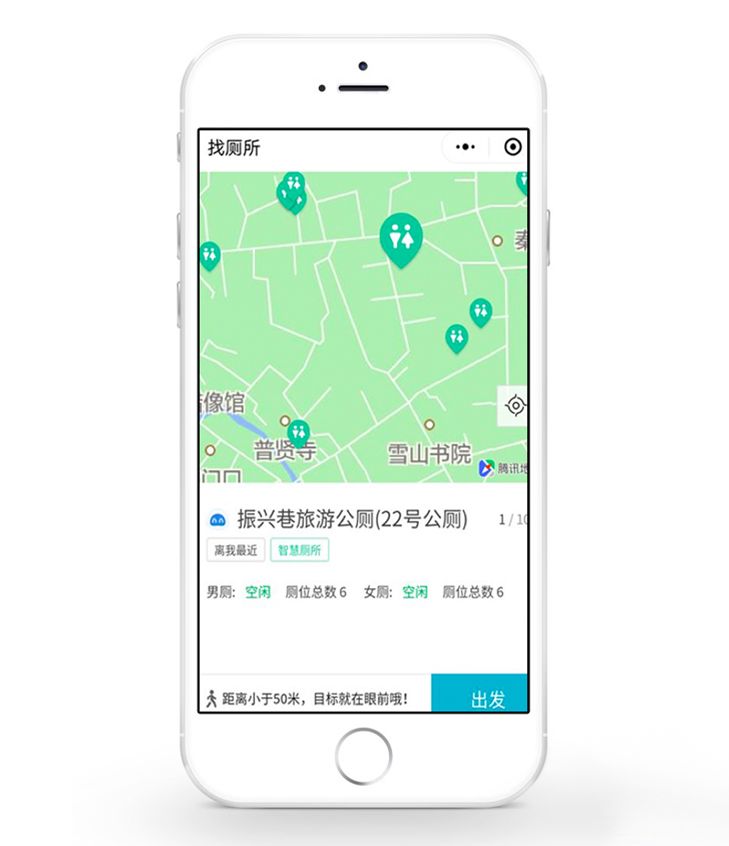 手機(jī)一鍵搜索距離最近的廁所,連廁所里有多少空位也會(huì)詳細(xì)顯示,讓你出門不怕”急”!