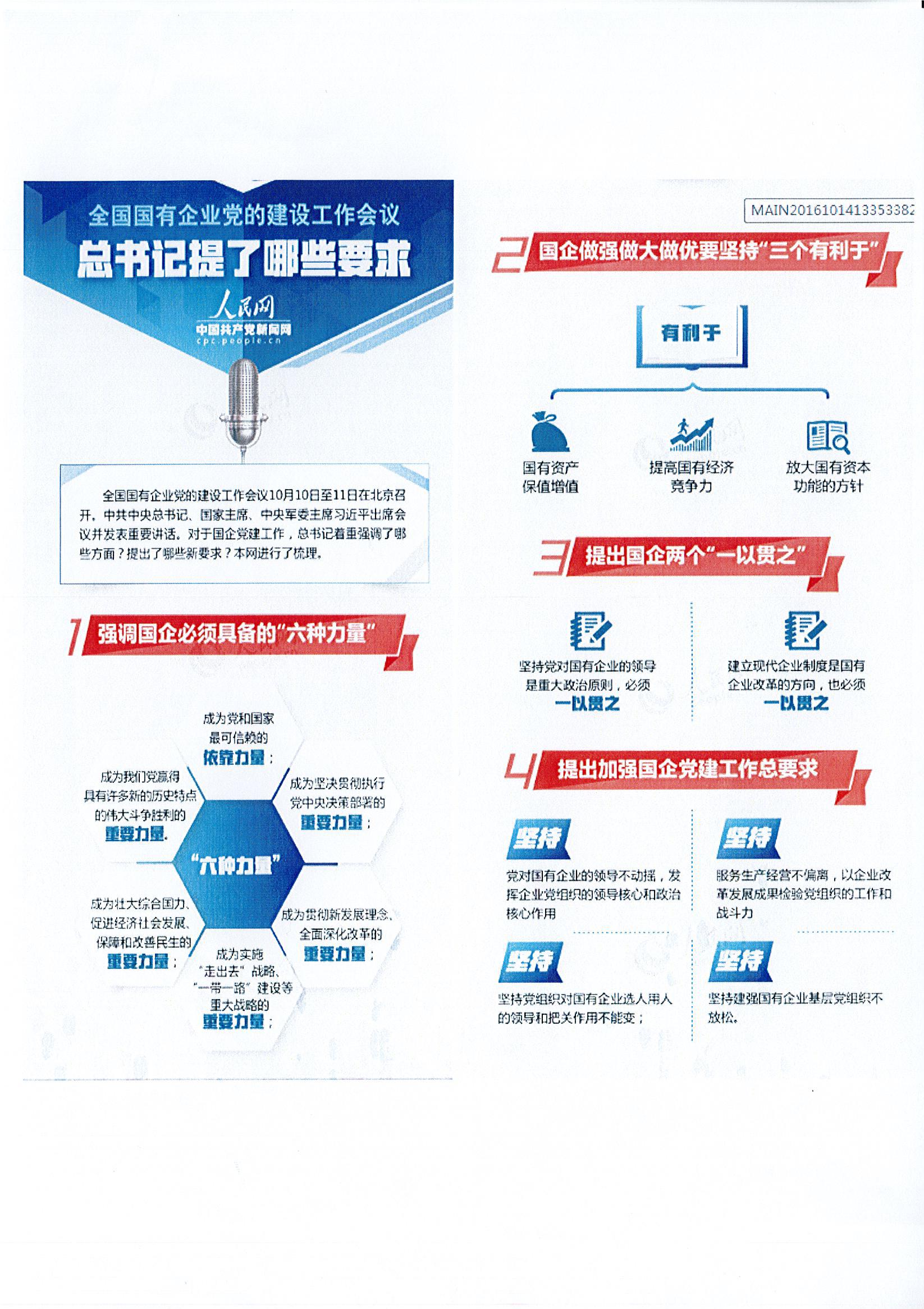 全國國有企業(yè)黨的建設工作會議2016年10月10日至11日在北京召開。中共中央總書記、國家主席、中央軍委主席習近平出席會議并發(fā)表重要講話。他強調(diào),要通過加強和完善黨對國有企業(yè)的領(lǐng)導、加強和改進國有企業(yè)黨的建設,使國有企業(yè)成為黨和國家最可信賴的依靠力量,成為堅決貫徹執(zhí)行黨中央決策部署的重要力量,成為貫徹新發(fā)展理念、全面深化改革的重要力量,成為實施“走出去”戰(zhàn)略、“一帶一路”建設等重大戰(zhàn)略的重要力量,成為壯大綜合國力、促進經(jīng)濟社會發(fā)展、保障和改善民生的重要力量,成為我們黨贏得具有許多新的歷史特點的偉大斗爭勝利的重要力量。要堅持有利于國有資產(chǎn)保值增值、有利于提高國有經(jīng)濟競爭力、有利于放大國有資本功能的方針,推動國有企業(yè)深化改革、提高經(jīng)營管理水平,加強國有資產(chǎn)監(jiān)管,堅定不移把國有企業(yè)做強做優(yōu)做大。